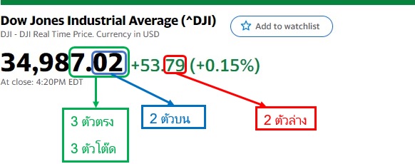 การออกรางวัลหวยหุ้นดาวโจนส์ หวยหุ้นชนิดนี้จะนำตัวเลขดัชนีการปิดตลาดหุ้นดาวโจนส์ มาใช้ในการออกรางวัล ในรูปแบบของตัวเลข 3ตัว และ 2 ตัวบน ส่วนเลขที่นำมาใช้ในการออกรางวัล 2 ตัวล่าง จะใช้ตัวเลขจากค่าการเปลี่ยนแปลงของดัชนีตามรูปด้านล่าง