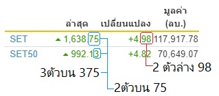 วิธีการแทงหวยหุ้นไทย คือการนำเลขจากการปิดตลาดหลักทรัพย์ของประเทศไทย (Stock Exchange of Thailand) หุ้นไทยมาอ้างอิงผลรางวัลหวยหุ้นไทย เราสามารถดูได้จากค่าของเลขSET และ SET 50 โดยผลหวยหุ้นไทยจะดูได้ที่เว็บไซต์ตลาดหลักทรัพย์ ตัวอย่างรูปด้านล่าง