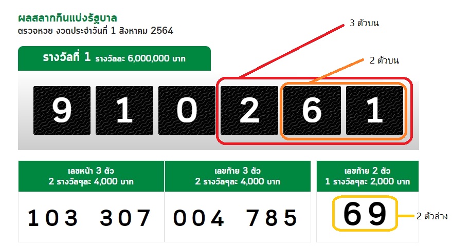 การดูผลรางวัลหวยไทยนั้น จะดูจากเลขที่อ้างอิงจากสลากกินแบ่งรัฐบาลไทย เป็นการเอารางวัลลอตเตอรี่มาออกเป็นรางวัลหวยไทยหรือหวยใต้ดินไทย ดั่งภาพด้านล่างนี้